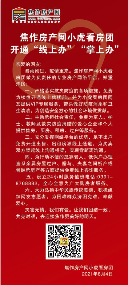 暴雨剛過,疫情重來。焦作房產(chǎn)網(wǎng)小虎看房團做為負責任的專業(yè)房產(chǎn)網(wǎng)絡(luò)平臺,鄭重承諾: